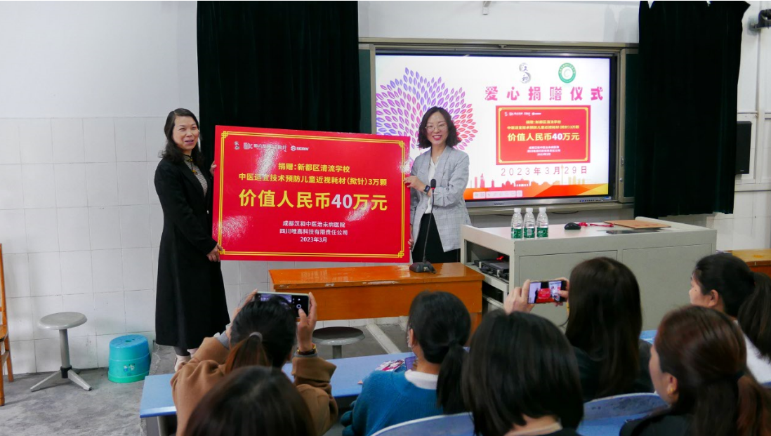 活動最后,舉行了愛心捐贈儀式。唯高集團向?qū)W校捐贈了價值40萬元的預防兒童近視中醫(yī)技術耗材撳針,共計3萬顆。全方位助力學校開展近視防控工作,充分發(fā)揮中醫(yī)藥改革試驗基地的優(yōu)勢,服務于轄區(qū)內(nèi)的兒童眼健康。會上,學校黨支部書記、校長劉元紅接收了唯高集團副總經(jīng)理朱蕓女士交予的捐贈牌。劉校長代表學校向唯高集團表示感謝,朱蕓女士表示希望通過開展這樣有意義的活動,帶動更多的家長和學生重視近視預防,也期待未來孩子們都有更加明亮的眼睛。